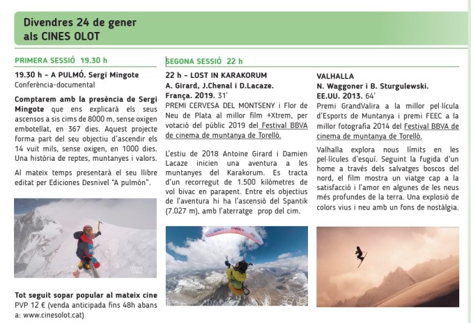 * Venda tiquets al web de cinemes Olot, des d’una setmana abans fins a 24 hores. Si prefereixes un menú adaptat (vegetarià, vegà, …) compra el tiquet i envia’ns un mail a info@vivimmuntanyes.cat